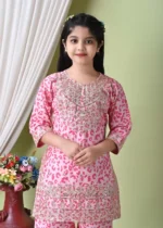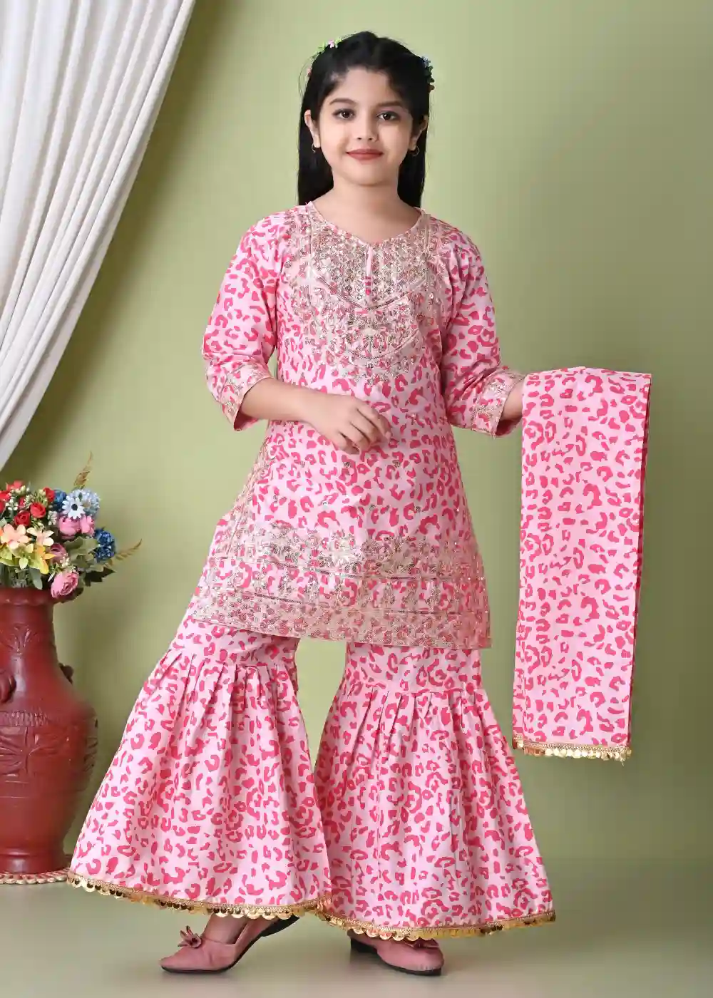 This tiger print pink sharara kurti set combines traditional ethnic styling with a bold printed design. The kurti pairs seamlessly with the sharara bottom, offering a comfortable and flowy fit. Ideal for festive gatherings, family functions, and special occasions, this outfit provides ease of movement along with visual appeal. Complete the look with ethnic footwear and subtle accessories for a well-coordinated ethnic ensemble.