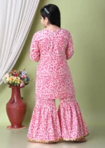 A stylish pink sharara kurti set with tiger print, suitable for festive occasions and ethnic wear. Designed for comfort with a modern traditional look.